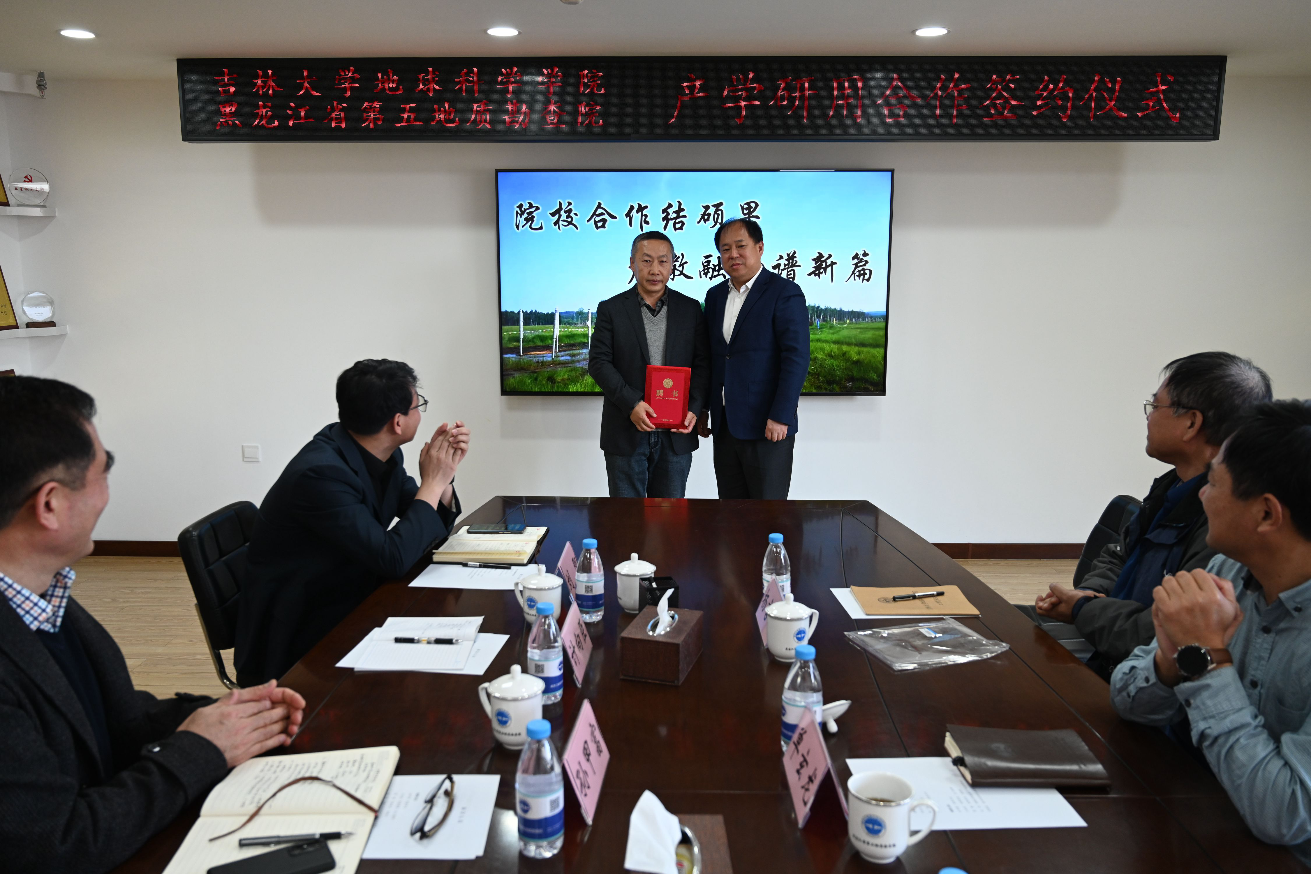 院长单玄龙、党委书记杨洲、资源工程系主任杨言辰,黑龙江省第五地质勘查院党委书记孙甲富、总工程师计向臣、副院长雷敏及相关工作人员等8人参加了签约仪式。