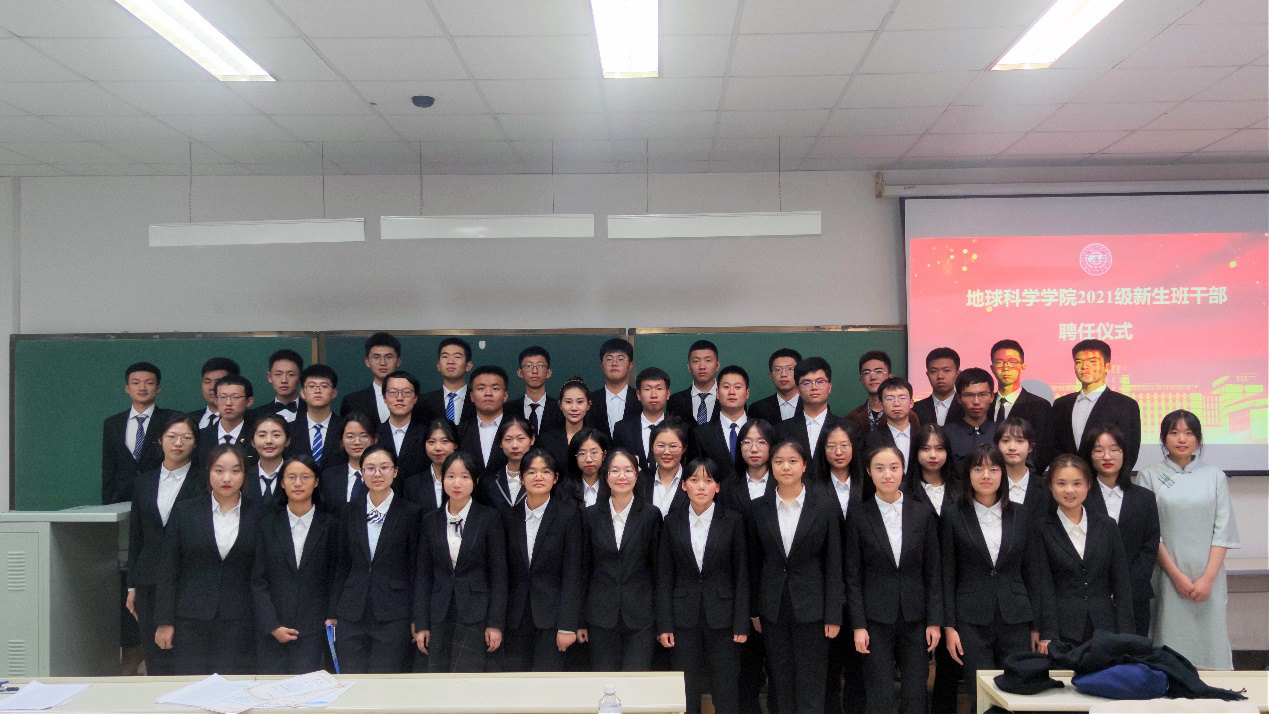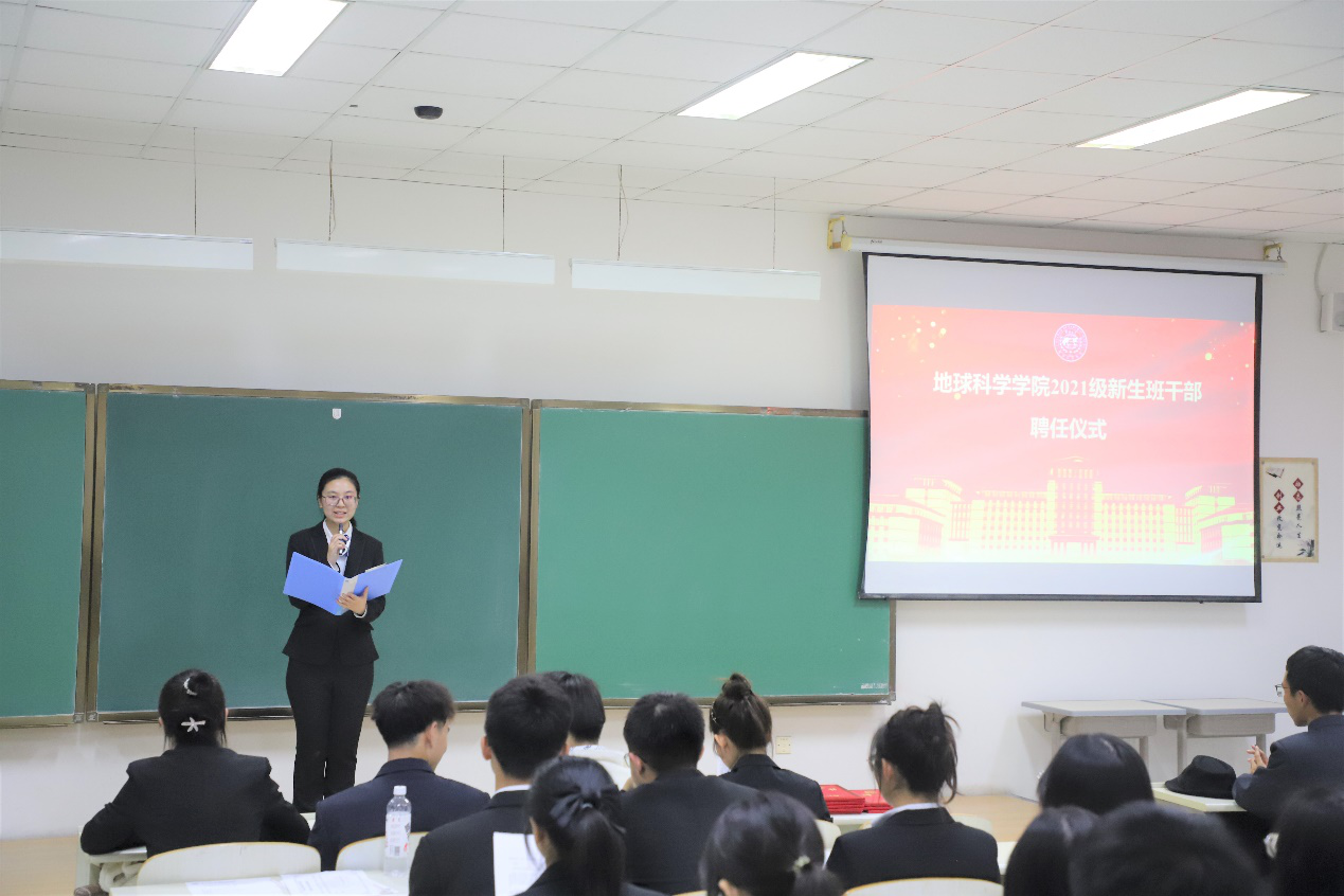 2021级本科新生班干部聘任仪式在李四光楼310教室顺利举行,参加仪式的有团委书记兼2021级辅导员韩旭老师、2020级辅导员助理以及2021级新任班干部。本次会议由姚欣欣同学主持。