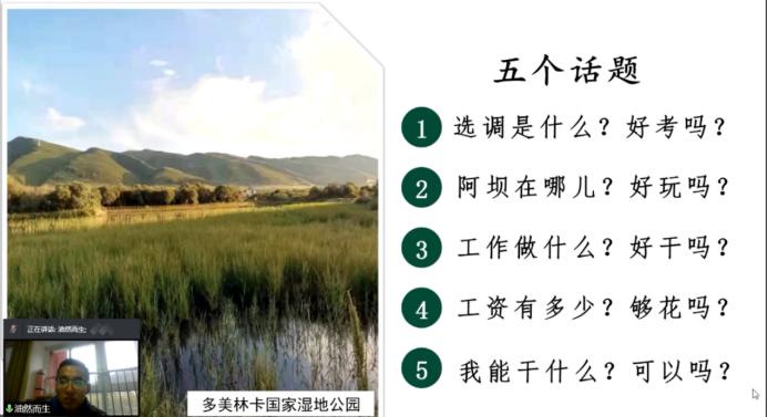 2021届硕士毕业生冷柚兵同学将个人理想与国家乡村振兴发展战略需求相结合,志愿去到四川省阿坝州的基层组织中,为国家发展建设贡献自身力量。冷柚兵以《当生态卫士,护净土阿坝》为题,从“选调是什么,好考吗;阿坝在哪儿,好玩吗;工作做什么,好干吗;工资有多少,够花吗;我能干什么,可以吗”五个方面进行了分享。同时,他也与同学们分享了四川优美的生态环境与独特的地方特色。他鼓励大家抓紧学习时间,提高工作能力,日后可以在自己的岗位上多做实事,为国家发光发热。