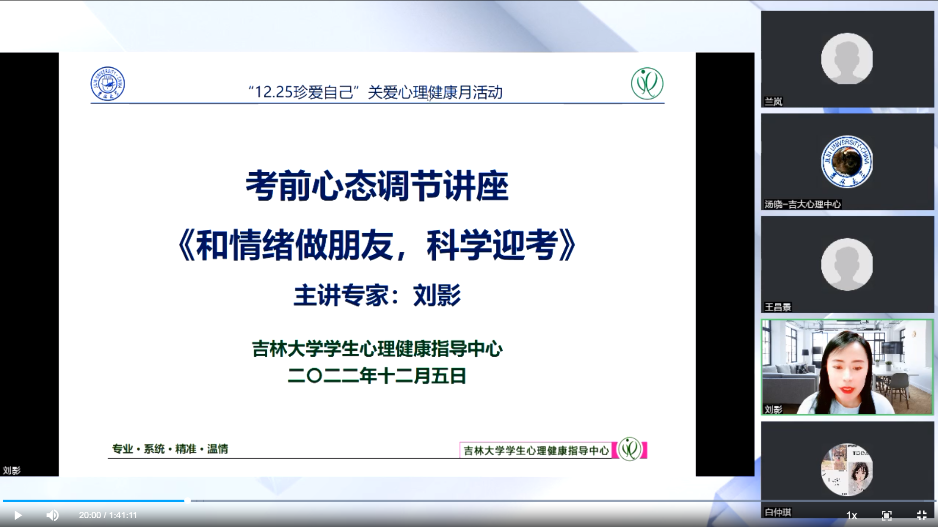 组织全体研究生以线上直播+录播的方式观看学习吉林大学学生心理健康指导中心开展的考研求职心理调适讲座和考前心态调节讲座。