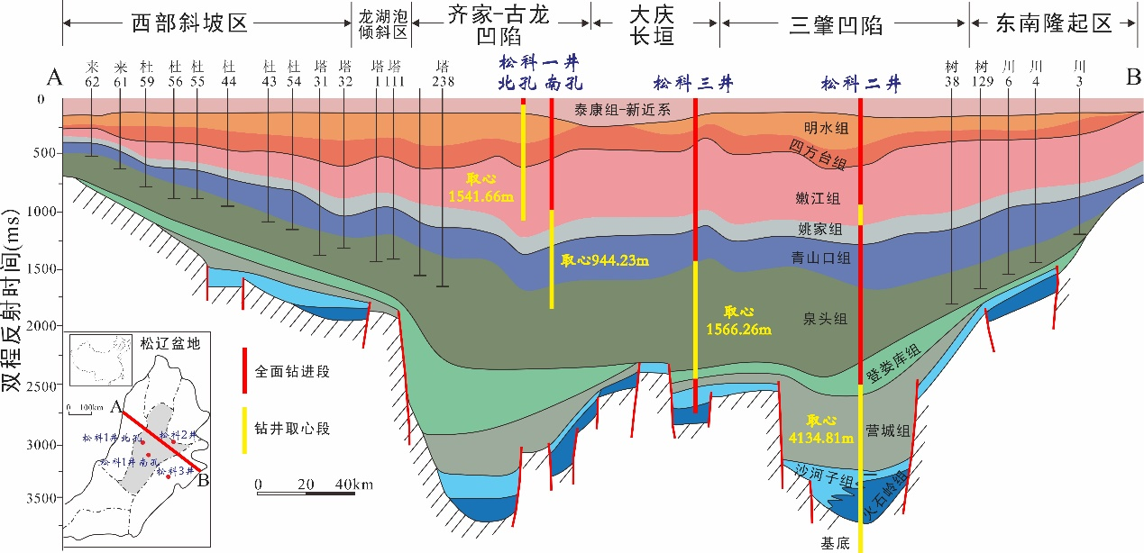 松辽盆地白垩纪大陆科学钻探“三井四孔”在过盆地大剖面的投影分布图