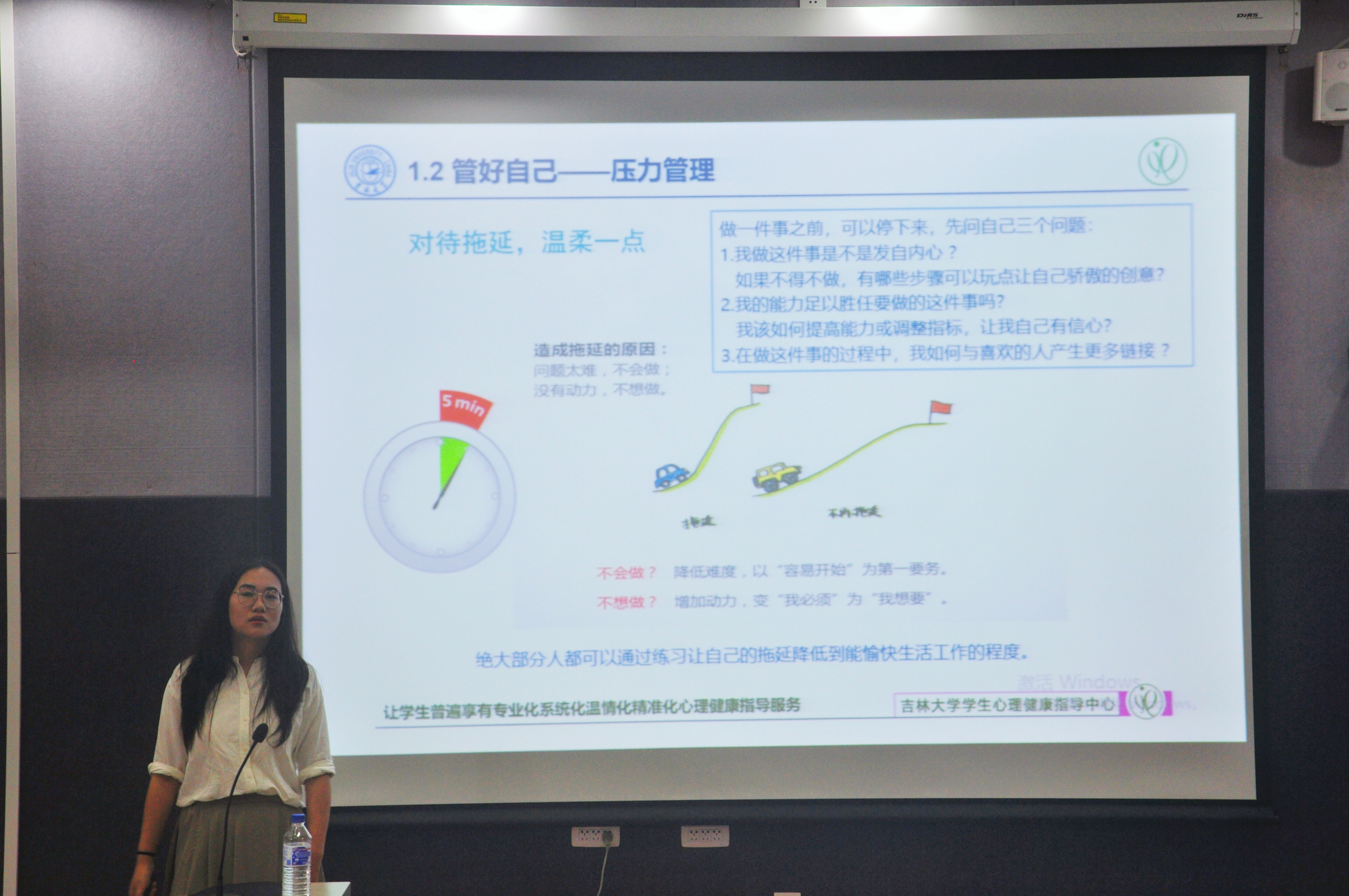 的心理健康指导服务等内容,从“管理好自己”、“利用好资源”两个方面展开,强调了目标管理、压力管理和时间管理的重要性和意义,给出了如何利用知识资源、人际资源和专业资源的宝贵建议。最后,张老师呼吁同学们在遇到难以解决的心理问题时,应主动寻求帮助,借助专业的力量,吉林大学学生心理健康指导中心的大门永远向同学们敞开。