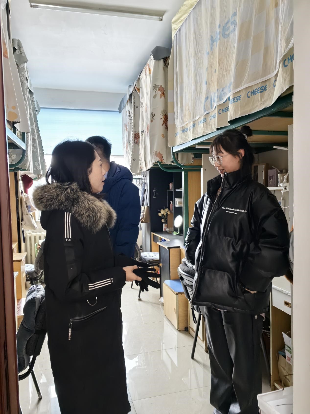 党委副书记马旭和研究生辅导员姜鹏走进研究生寝室了解研究生思想动态和学习生活情况,并开展安全卫生检查。在走访过程中,马旭书记对研究生的专业学习内容、目前的科研重点和学习节奏的把握情况一一进行了了解。同时,她耐心询问了同学们的日常生活状态,并叮嘱大家合理安排日常起居,为自己的学习生活创造良好的环境。此外,马书记还强调要注意用电安全,提醒同学们注意插排的使用,及时更换旧插排,做到“人走电断”等安全细节。