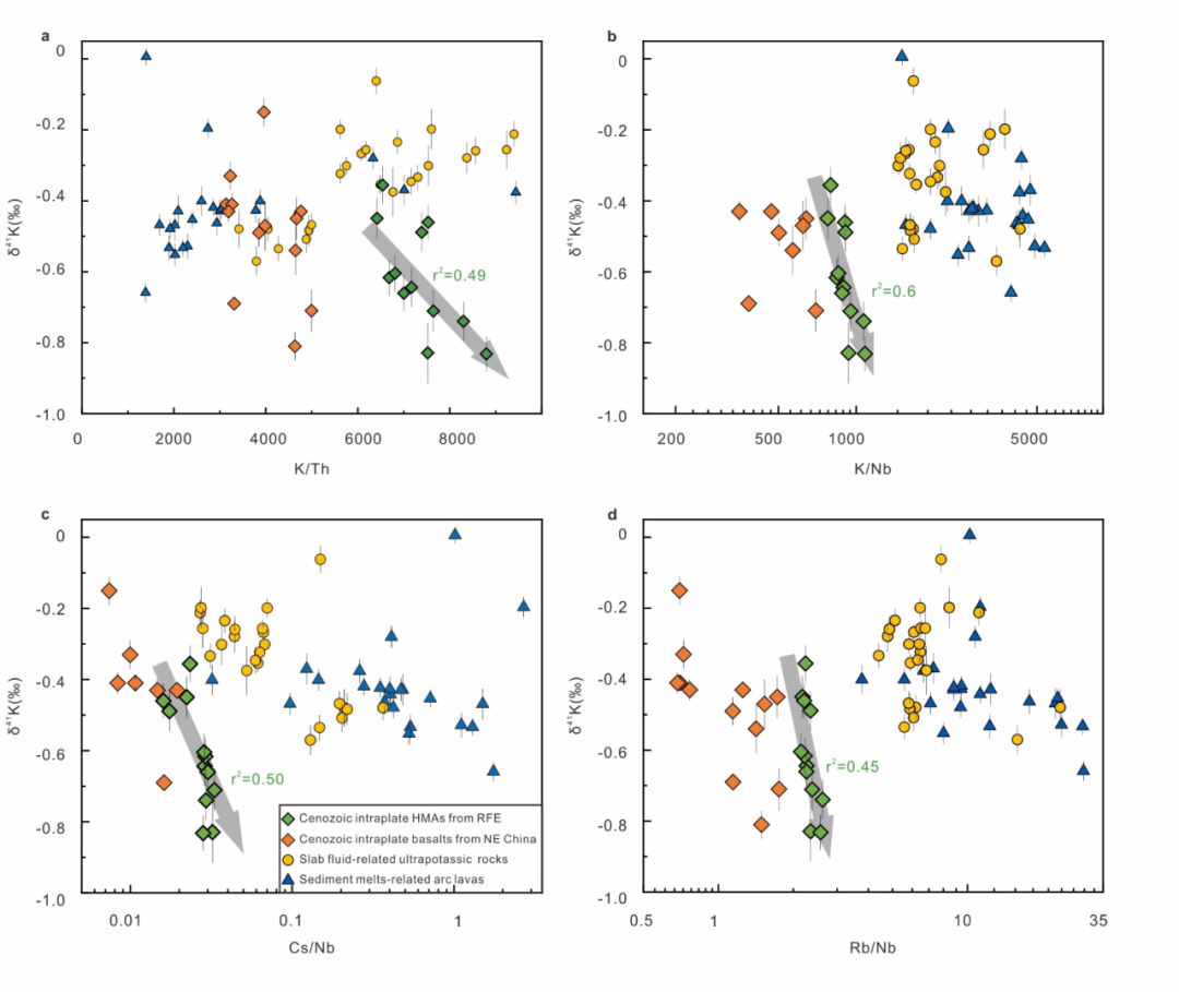 1. 首次利用K同位素示踪深部水循环过程。K在俯冲以及在地幔过渡带中与水的行为具有高度一致性,且不受去气作用的影响。在地幔部分熔融过程中,K几乎全部进入熔体,且俯冲板片中的K可以通过一系列含K矿物到达地幔过渡带的深度。另外,地表物质与地幔在K同位素组成上存在显著差异,因此,K同位素是示踪深部水循环的理想工具。