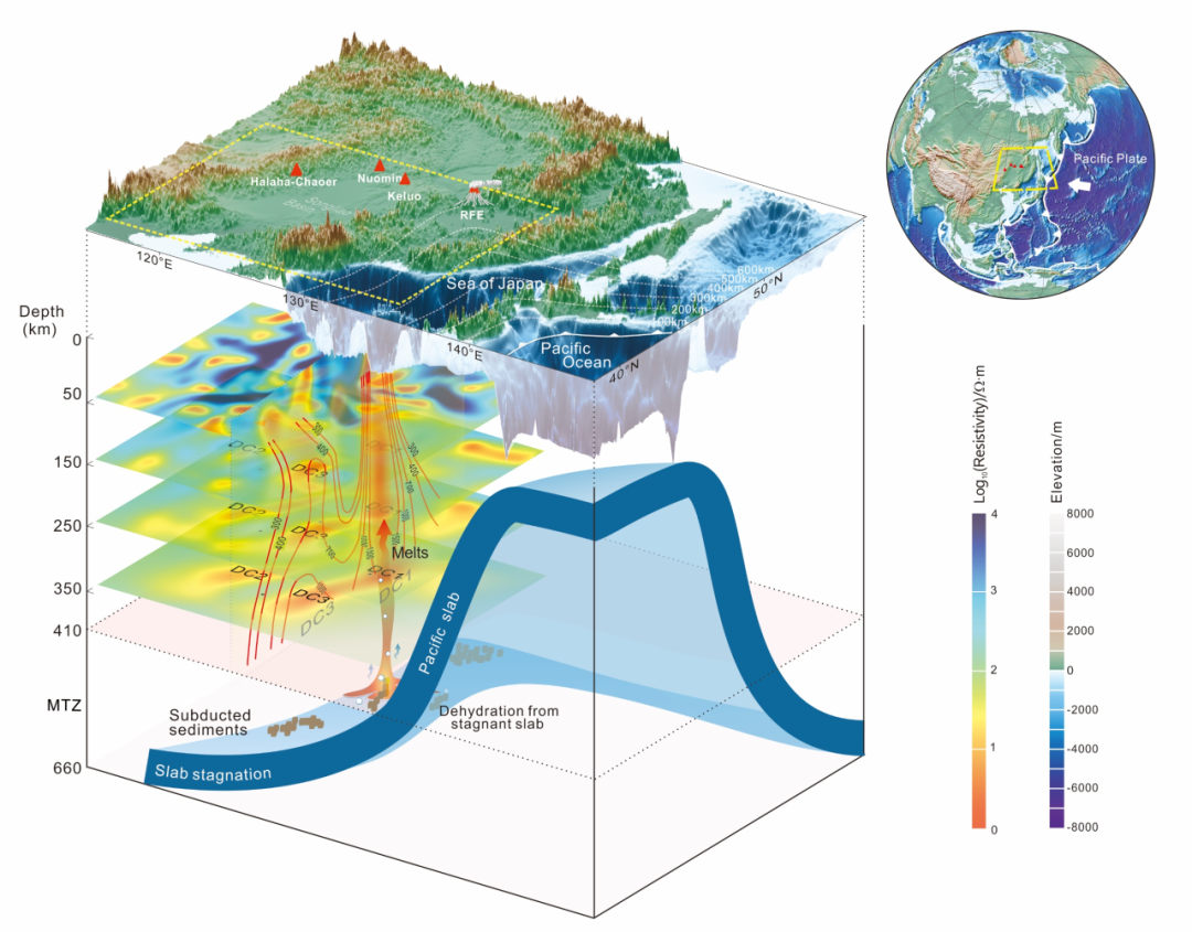 针对上述问题,吉林大学许文良教授和其引领的“地球深部动力学创新团队”成员王枫教授等,选择以东北亚新生代高镁安山岩为代表的板内火山岩作为研究对象(图1),通过地质学、地球化学、地球物理、高压物理等多学科交叉综合研究,证实了东北亚地区地幔过渡带中存在板块俯冲作用运移的地表水,并通过板内火山作用返回到地表,从而实现地球浅部圈层和深部圈层间的水循环,本项研究同时还估算了地球内部与表层水的交换通量。具体成果如下: