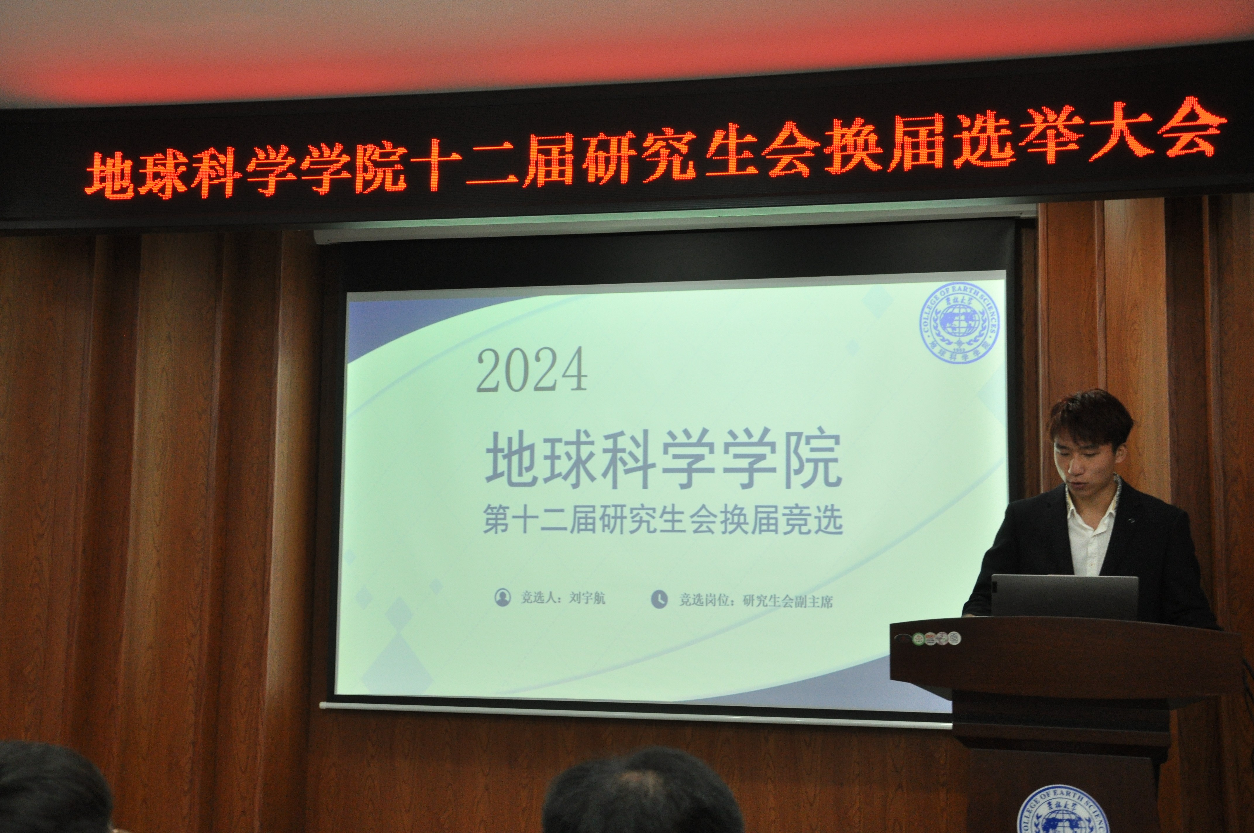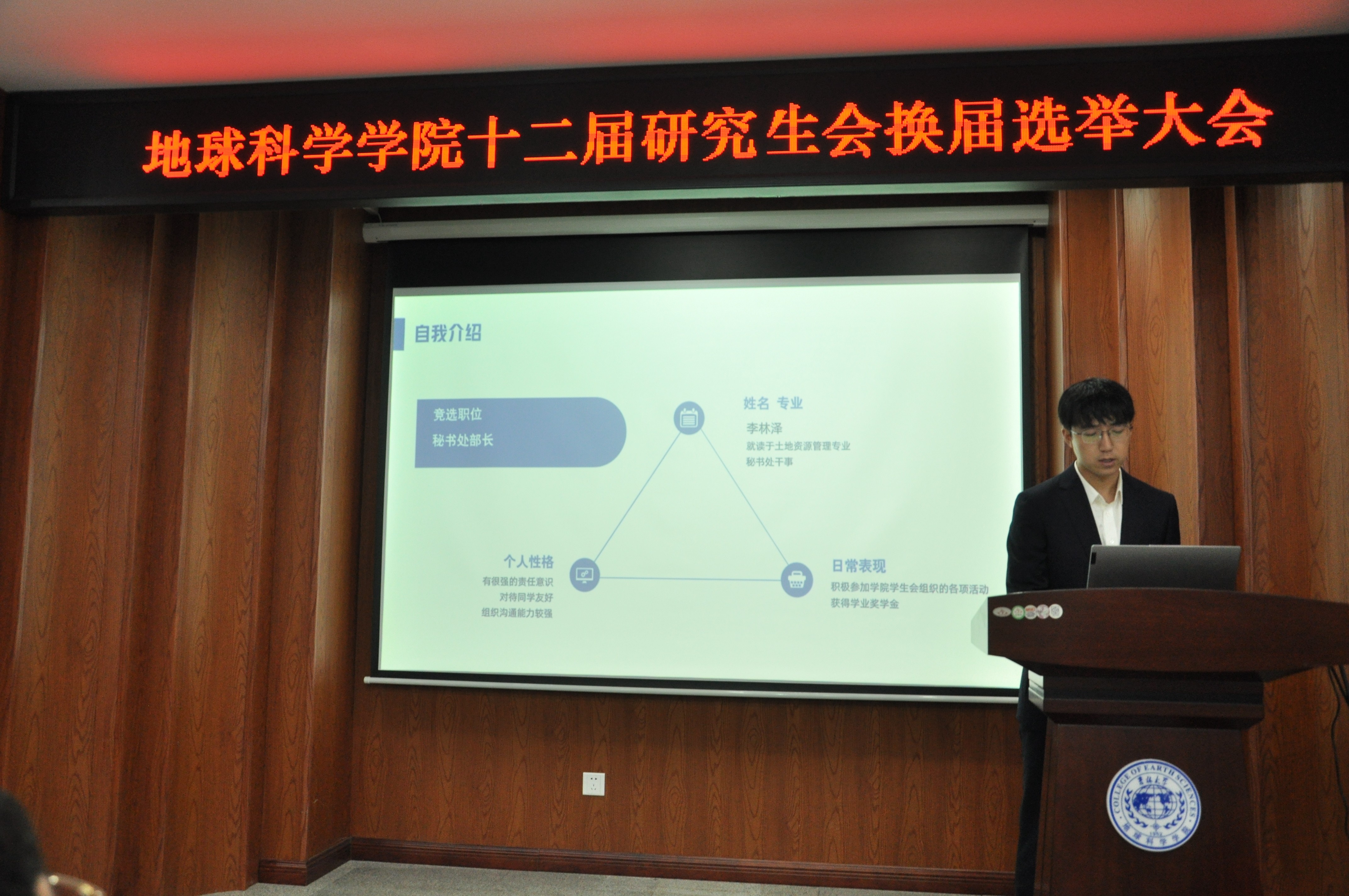 第十二届研究生会换届选举大会在鸽子楼一楼报告厅举办,大会由第十一届研究生会副主席程澄主持。