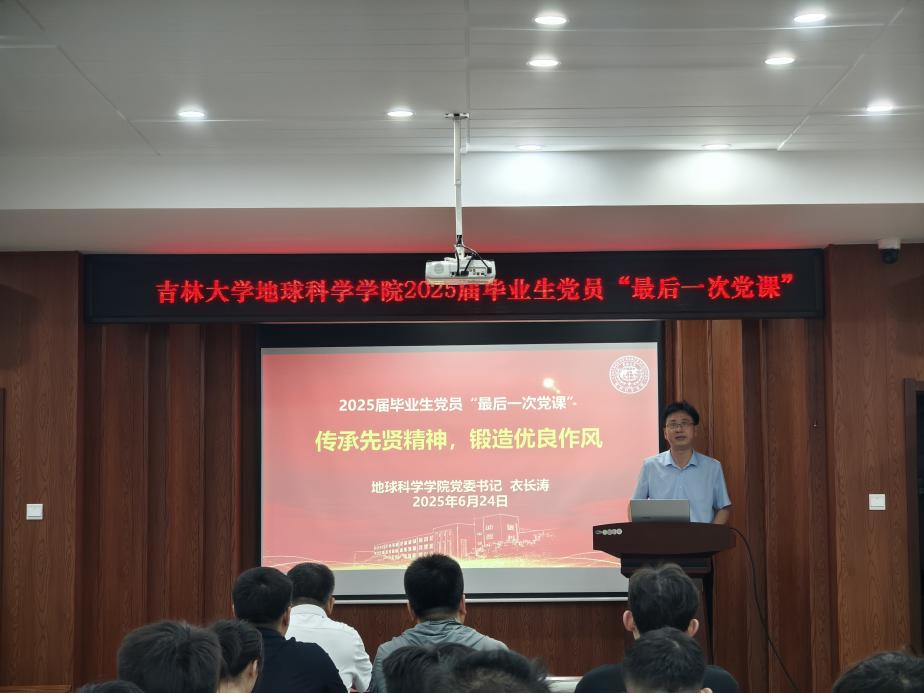 党委书记衣长涛在鸽子楼报告厅为全体2025届毕业生党员讲授“最后一次党课”,会议由六合彩即时开奖