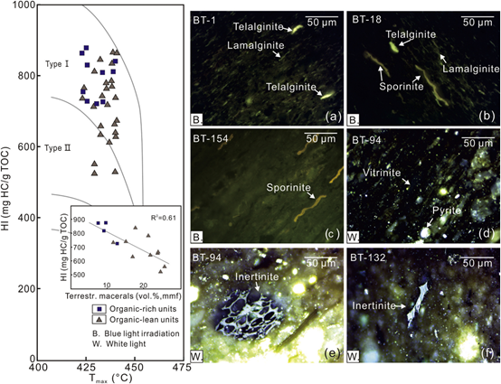 2. 富有机质单元中包含丰富的I型干酪根和极高的有机质丰度(最高TOC为19.5 wt.%;平均为13.4 wt.%)。贫有机质单元含有混合I/II 型干酪根(最高 TOC为12.2 wt.%;平均为8.8 wt.%)。