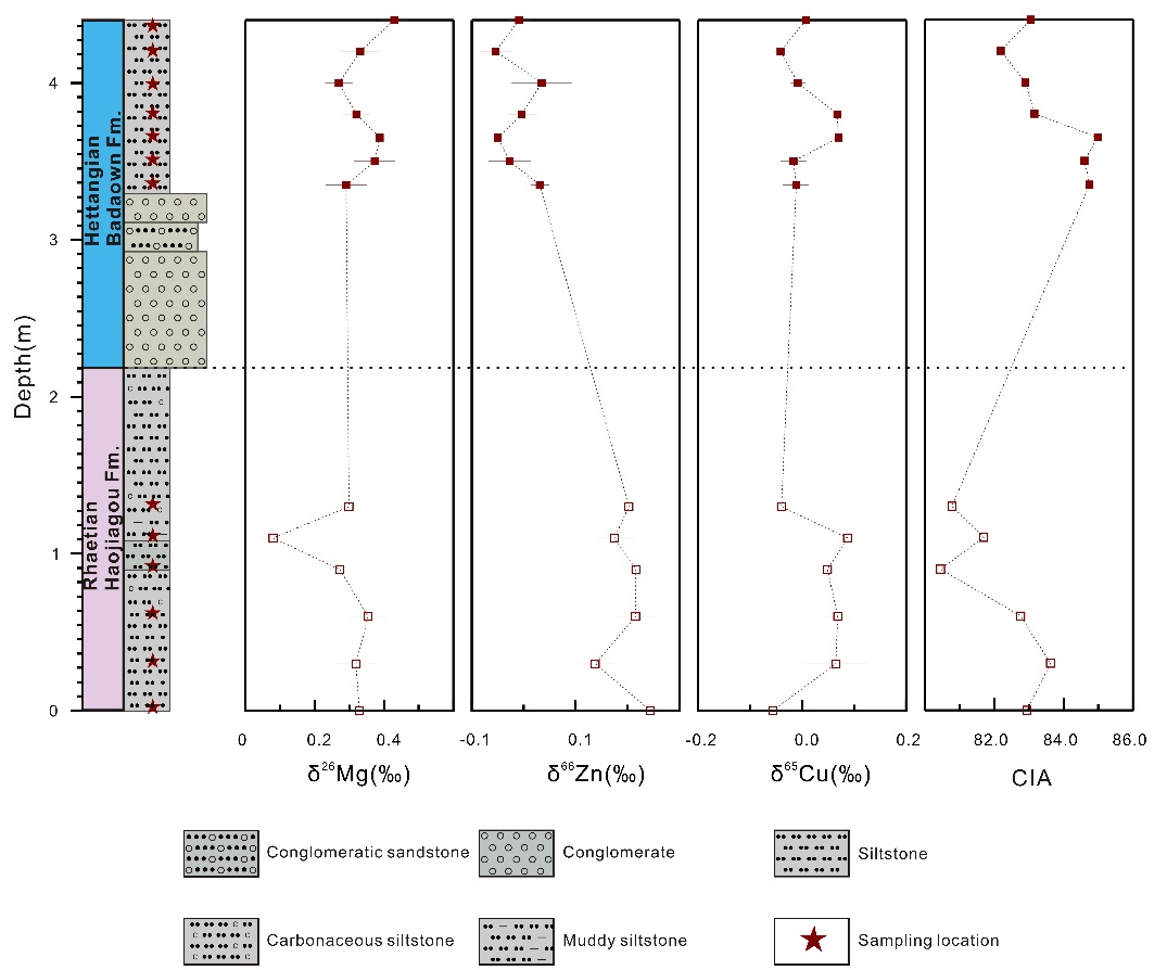 许文良教授团队的博士研究生邢恺晨和王枫教授(通讯作者)等人,联合美国华盛顿大学非传统实验室Fang-Zhen Teng教授和中国地质大学(武汉)地质过程与矿产资源国家重点实验室李明高级工程师,对早中生代期间位于高纬度地区的新疆准噶尔盆地南缘的一套连续沉积的三叠系—侏罗系陆相剖面(郝家沟组-八道湾组,图1)进行了全岩主微量元素和Mg-Cu-Zn同位素系统研究(图2),得到如下认识: