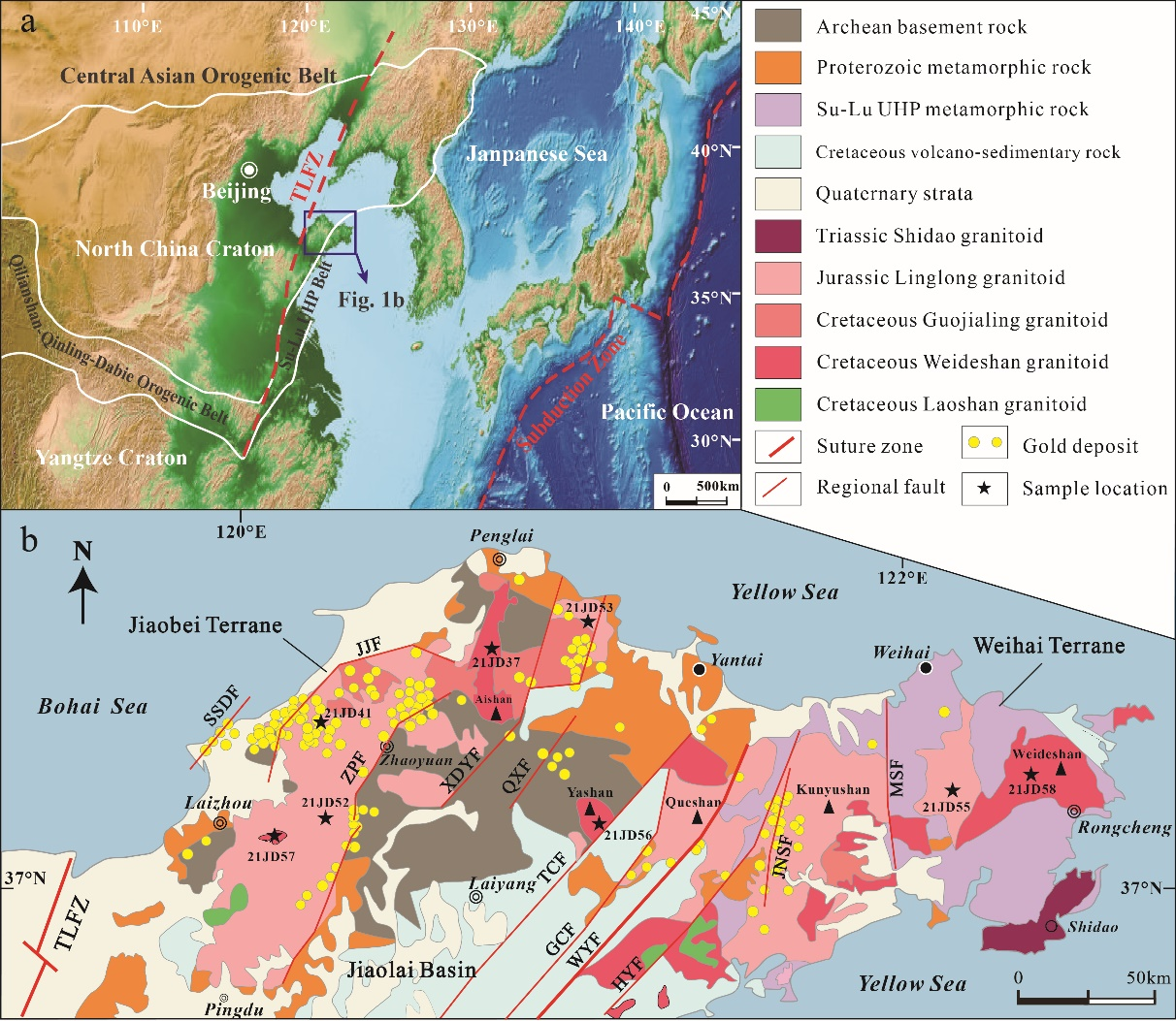 近日,GSA Bulletin正式发表了吉林大学周建波教授科研团队联合山东省地矿局第六地质大队丁正江研究员科研团队研究成果。胶东半岛位于华北克拉通东南缘,是中国最大的黄金产区。晚中生代古太平洋板块俯冲作用引发了华北克拉通大规模的壳幔相互作用及爆发式成矿事件,但古太平洋俯冲—华北克拉通破坏与岩浆作用、成矿作用的耦合关系尚不清楚。有鉴于此,研究团队对胶东半岛广泛分布的岩浆岩展开系统调查,选取广泛出露的晚侏罗世玲珑期岩浆岩和早白垩世伟德山期岩浆岩样品系统开展锆石U-Pb及原位Hf同位素,全岩主微量和Sr-Nd-Pb同位素分析测试,结合大量已有年代学和地球化学资料,以深化认识胶东半岛大规模岩浆活动时间、成因和地球动力学背景及与金成矿关系,提出了胶东金矿为“造山带叠合型金矿”的新认识。