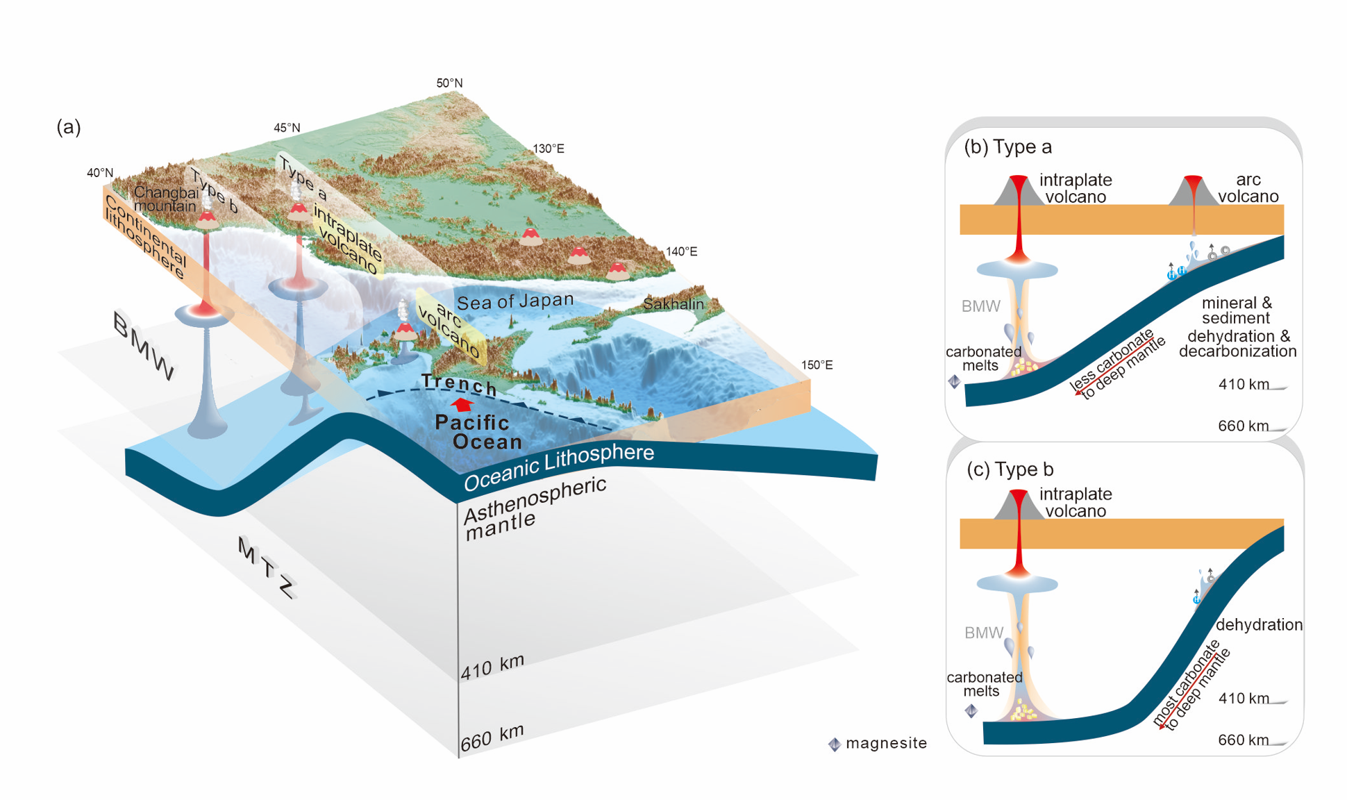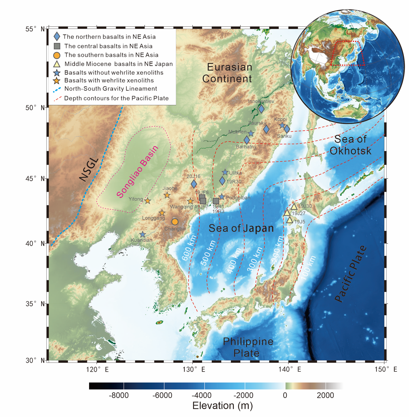 许文良教授引领的“吉林大学地球深部动力学创新团队”联合中国地质大学(北京)刘盛遨教授,对东北亚陆缘、平行于俯冲带分布的中新世板内玄武岩开展了系统的Mg-Zn同位素研究(图1),结合东北亚陆缘新生代玄武岩中地幔捕虏体的空间分布和地球物理观测资料,为单一俯冲带小尺度碳输入的三维空间变异提供了关键证据。具体研究成果如下:
