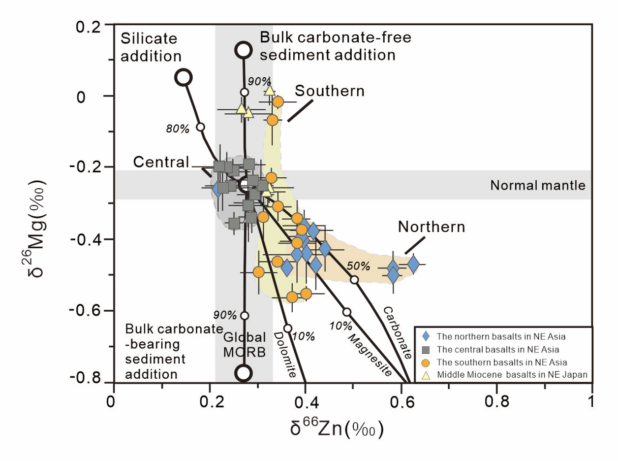 1)发现平行俯冲带走向分布的中新世板内玄武岩的Mg-Zn同位素组成存在明显的空间变异。东北亚陆缘北部地区中新世玄武岩显示了Mg-Zn同位素耦合的特点(图2)。与之不同,南部地区同时代玄武岩显示了Mg-Zn同位素组成解耦的特点。中部地区玄武岩则显示了Mg-Zn同位素组成轻微解耦的特点。中新世玄武岩Mg-Zn同位素组成的空间变化暗示俯冲带沿海沟方向存在明显的碳输入的空间差异。