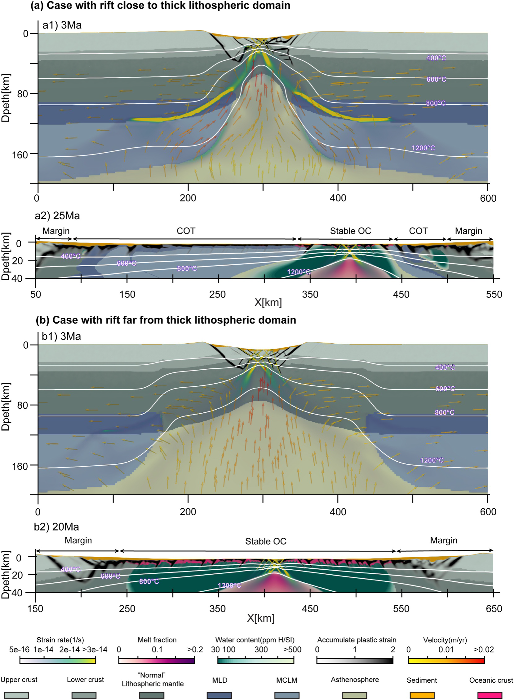 一、被交代的克拉通岩石圈地幔可远距离抑制裂谷岩浆活动。 模拟结果表明,当裂谷邻近厚而亏损的被交代克拉通岩石圈地幔时,该地幔因密度低于软流圈而具有浮力,会在岩石圈减薄驱动下向裂谷中心流动,阻碍软流圈上涌和减压熔融,从而显著延迟洋壳的形成。岩石圈内部的流变学薄弱面(如MLD)可有效解耦浅部与深部岩石圈变形,加速亏损地幔向裂谷中心的汇聚,使岩浆滞后期延长约15百万年,大陆-洋壳过渡带宽度可超过200公里。
