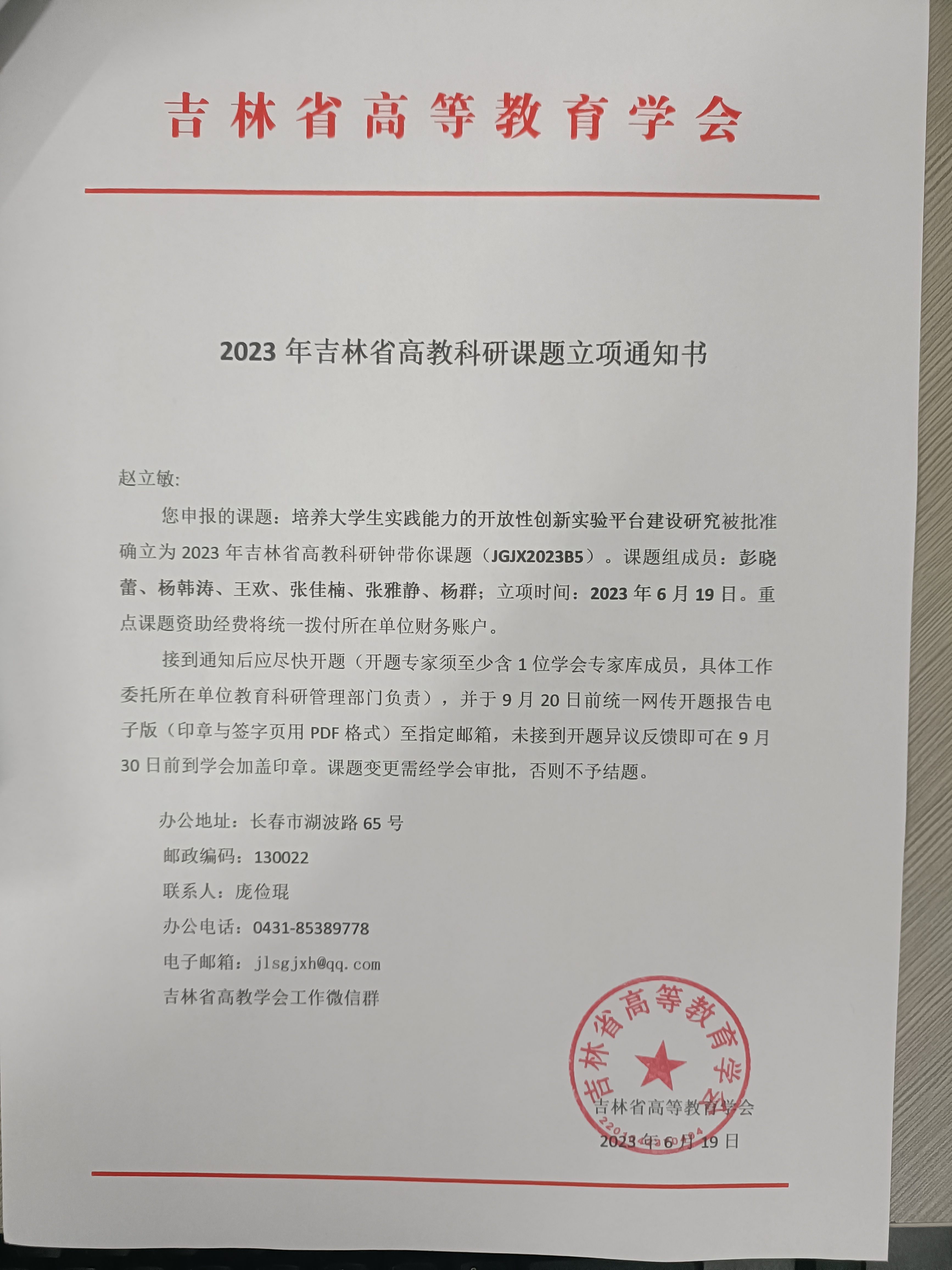 经各高校申报,省高教学会组织专家组初评、复评和终评,中心赵立敏负责的“培养大学生实践能力的开放性创新实验平台建设研究”项目,被确立为2023年吉林大学高教科研课题重点项目,项目编号JGJX2023B5。2023年吉林大学高教科研课题重点项目共立项58项,其中重点课题6项、重点自筹课题10项、一般课题42项。相关信息可在吉林省高等教育学会官方网站(