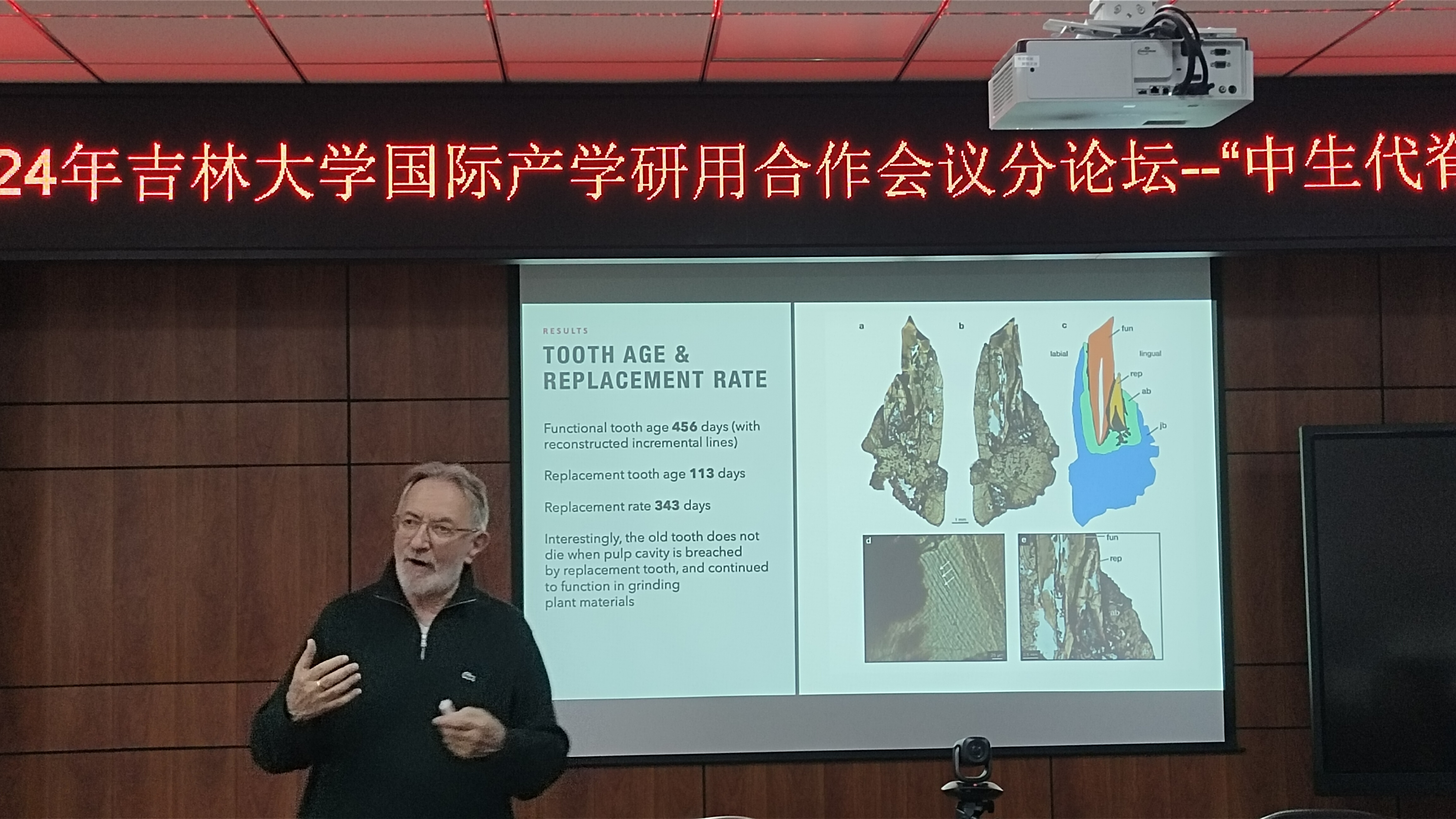 Robert Reisz院士以“中生代陆生脊椎动物牙齿的演化”为题,介绍各类不同陆生脊椎动物的牙齿咬合模式和替换速率,以及具体研究的方法组合。